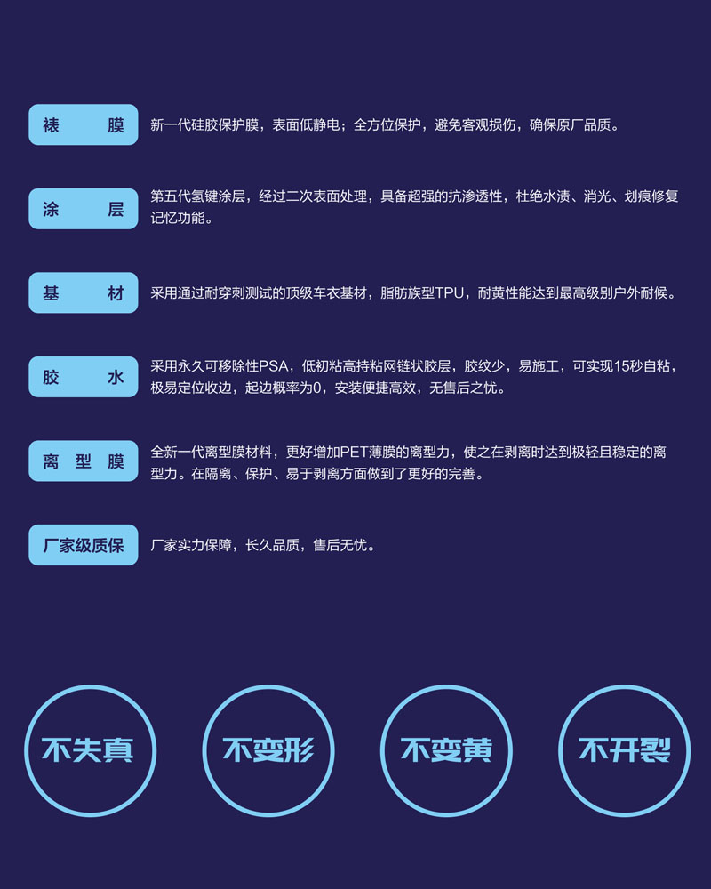 海菲尔超强耐污涂层 ,超强修复TPU, 具有极强韧性,能有效的防止剐蹭以及高速行驶中的小石子、 沙粒对原厂车漆的伤害,阻隔紫外线、酸雨、虫尸斑、鸟粪 等外界污染源对车身的腐蚀。目前已经经过七年中国市场实车验证。